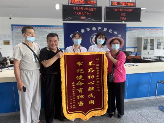 一面锦旗、一种责任、一份担当。县不动产综合窗口将再接再厉,围绕百名股长“五比五评”活动和建设不动产登记队伍,以群众满意、企业放心为标尺,推行延时服务、预约办理、上门办理等个性化服务模式,着力打通为民服务“最后一公里”,以优异成绩奋力推动全县经济高质量发展。(黄丽娜)