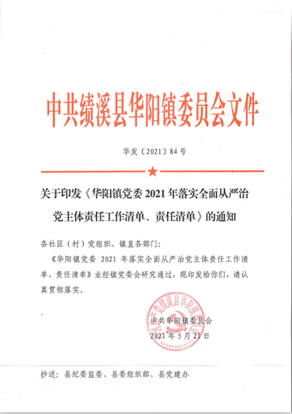 “明确6个方面责任内容细化27条措施压实班子成员和相关部门责任,针对上级点的、日常工作中发现的、民主生活会查摆出的问题,对症下药,提出相应的整改措施,确保全面从严治党纵深推进……”近日,华阳镇印发《2021年落实全面从严治党主体责任工作清单、责任清单》,建立完善全面从严治党主体责任工作清单、责任清单、时限清单,明确了党委书记、领导班子成员、各相关部门的责任,着力构建职责明晰、目标具体的责任体系,推动“两个责任”贯通联动、一体履行。