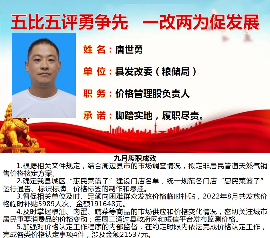 为深入学习贯彻习近平总书记关于作风建设重要论述、落实省委“一改两为五做到”要求,着力解决个别干部作风中“虚、躲、冷、粗、假”等顽瘴痼疾,我县组织开展了县直单位百名股长“五比五评”活动。根据活动《实施方案》要求,现将2022年度100名参评对象9月份履职成效分期进行公示。
