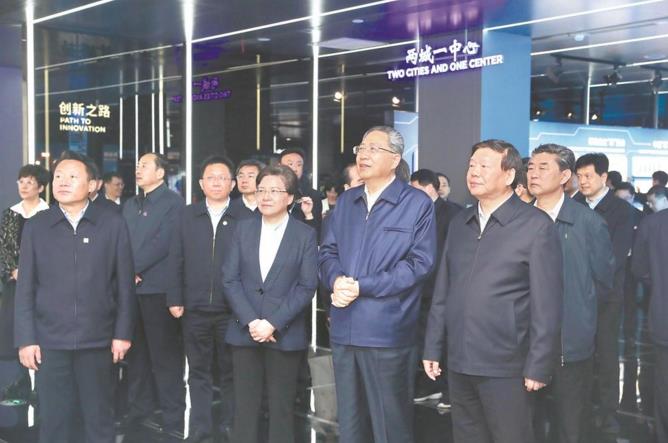 4月22日下午,省委书记李锦斌率安徽省党政代表团在江苏省委书记娄勤俭陪同下,考察南京市江北新区规划展览馆,了解江北新区规划建设最新进展、南京市与安徽省毗邻地区跨界合作发展规划布局和重大基础设施工程建设情况。本报记者 徐国康 摄