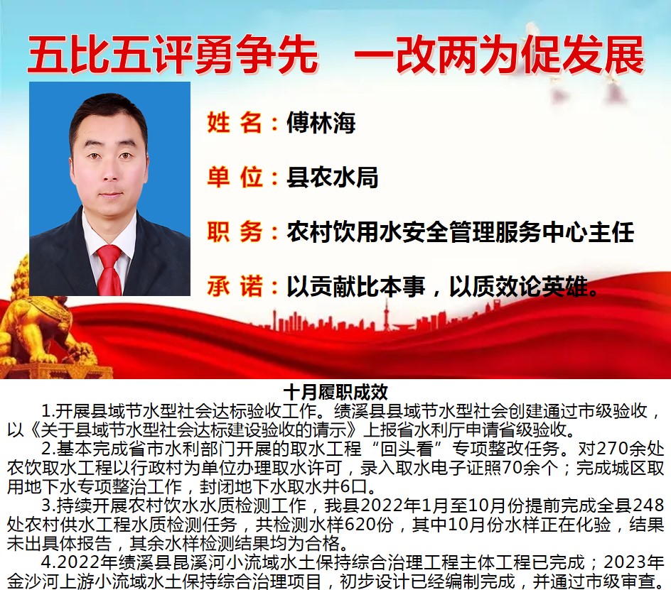 为深入学习贯彻习近平总书记关于作风建设重要论述、落实省委“一改两为五做到”要求,着力解决个别干部作风中“虚、躲、冷、粗、假”等顽瘴痼疾,我县组织开展了县直单位百名股长“五比五评”活动。根据活动《实施方案》要求,现将2022年度100名参评对象10月份履职成效分期进行公示。