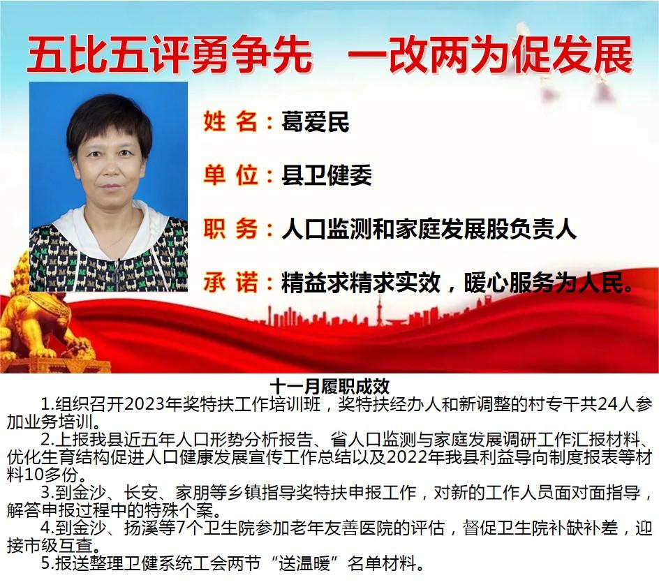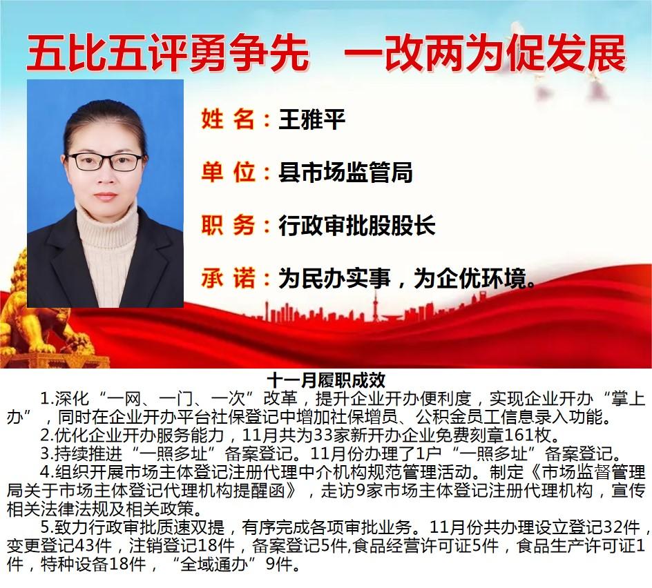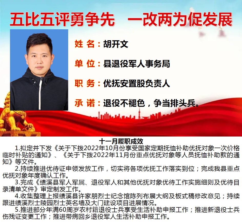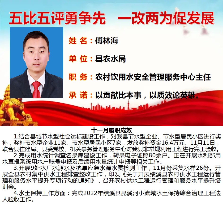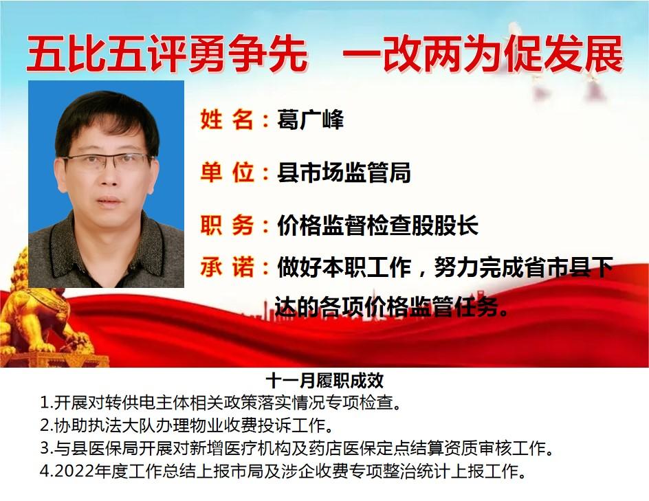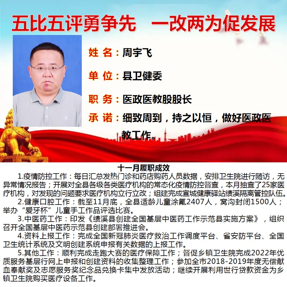 为深入学习贯彻习近平总书记关于作风建设重要论述、落实省委“一改两为五做到”要求,着力解决个别干部作风中“虚、躲、冷、粗、假”等顽瘴痼疾,我县组织开展了县直单位百名股长“五比五评”活动。根据活动《实施方案》要求,现将2022年度100名参评对象11月份履职成效分期进行公示。