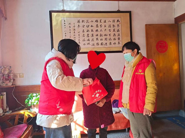 妇联干部和巾帼志愿者将内含体温计、医用口罩、抗原、消毒凝胶等防疫物资的“爱心防疫包”送到农村老年妇女、孤寡老人、生活困难妇女、留守儿童等重点人群手中,叮嘱她们如何正确使用爱心防疫物资,为她们送去新春的问候和祝福。