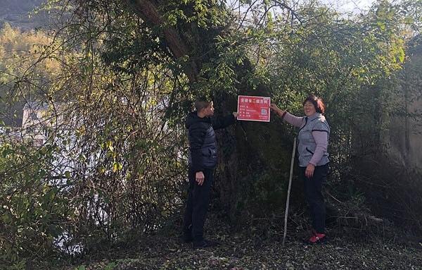 为加强古树名木的保护和管理,家朋乡林业站对登记在册的七株二级古树进行了挂牌保护。?;づ粕媳曜⒘耸髦?、编号、拉丁名、科属、?;さ燃丁⑹髁?、日期和二维码等信息,扫描二维码还能深入了解该古树名木。挂牌严格按调查的GPS坐标点认真逐株进行核对,利用古树挂牌这一契机,做到一树一档、一树一牌。