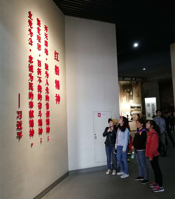 南湖革命纪念馆内,人头攒动,共青团员们怀着崇敬的心情参观党的光辉历程。从中国近代史、中国革命史到社会主义建设和改革开放时期,一部波澜壮阔的历史画卷徐徐展开。参观者们透过“虎门销烟”“开国大典”“嘉兴火车站”等等如身临其境般的场景展现,共产党宣言、五四爱国运动资料等文字图片,感受革命先烈的“红船精神”,传承红色基因和红色文化。
