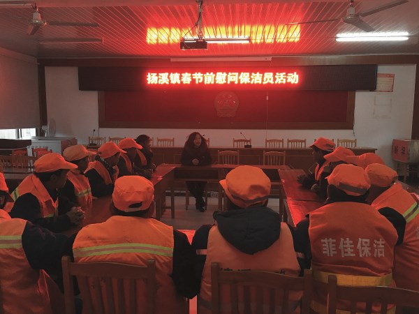 随着春节的临近,为感谢过去一年里扬溪镇保洁员们为辖区内环境卫生工作付出的辛勤劳动,2月12日下午,扬溪镇党委、政府召集辖区内31名保洁员共聚一堂,举办了“新春走基层系列活动”--慰问保洁员活动,为大家送上春节的慰问品及祝福。