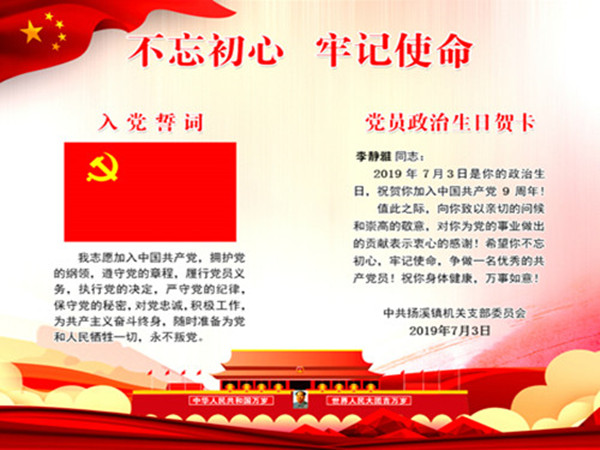 “读着入党誓词和温情寄语,感觉又回到了刚入党的那一刻,感慨这份礼物弥足珍贵,今后的工作中,我会加倍努力,时刻表现出一名基层党员该有的样子。”扬溪镇机关支部的党员小李在收到党组织发来的党员政治生日电子贺卡时激动地说。