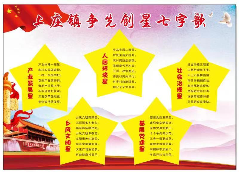 上庄镇自开展村党组织“争先创星”工作以来,高度重视工作实效,积极开拓思路,创新工作举措,把产业发展、人居环境、社会治理、乡风文明、基层党建五个方面的主要内容融入到“七字歌”里面,编写通俗易懂的“七字歌”。朗朗上口的七字歌概括融合了“争先创星”五大方面的关键要点和主要内容,简洁易懂、寓教于乐,营造了村党组织“争先创星”的浓厚氛围。通过张贴宣传牌、发放宣传单、微信转发等多种方式,加大宣传力度,让“七字歌”传入千家万户。(周思妍)