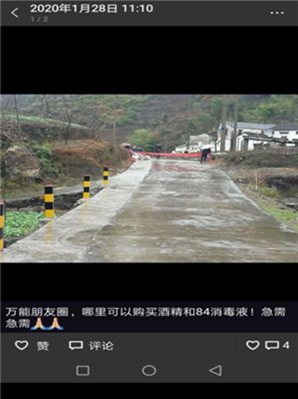 这是胡迪在朋友圈求购物资的内容。西川村每天都要进行消毒,物资需求量大,为保障供应,胡迪还向朋友圈求购酒精和84消毒液,扩大购买范围。一进到西川村防疫卡点,便能明显闻到一股消毒水的味道。为防控疫情,西川村设置了防疫卡口,严格控制过往人员。卡点的执勤人员对过往人员进行逐一登记,掌握时间、身份等相关信息,并对过往人员进行消毒、检测体温。"消毒工作不能放过任何一个细节,像口罩这样的废弃物,我们要用消毒水喷几下,然后再装进专用的垃圾袋,统一收起来,集中处理。虽然复杂点,但对于防控病毒还是挺有用的。"谈起工作,胡迪说得头头是道。