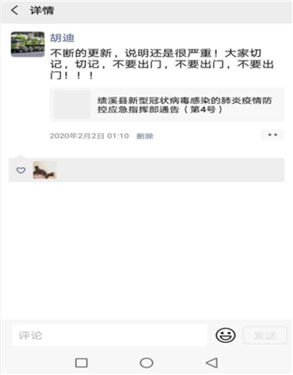 2月2日朋友圈:“不断的更新,说明还是很严重,大家切记,切记,不要出门!”
